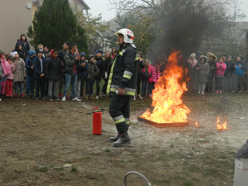 Intézményünk udvarán tálcatűzgyújtás keretein belül tanulóink aktív részesei lehettek a tűz eloltásának porral oltó segítségével. A bátrabbak lángoló gázpalackot is olthattak Lukács István tűzoltó szigorú ellenőrzése mellett. A nap végén diákjaink könnyes szemekkel vették tudomásul, hogy a tűz nem terjedt tovább a főépületre, melléképületekre, de élményekkel telve térhettek haza.