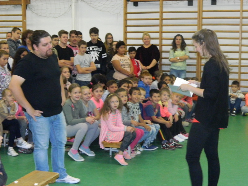 1956. október 23. A forradalom és szabadságharc történéseit igazán még nem értik tanulóink. Az EFOP-3.1.8-17-2017-00033 „Együtt, testvérként a Kéki Iskolával” elnevezésű projekt kiváló lehetőséget nyújtott, hogy a gyerekek megismerjék nemzeti ünnepünk eseményeit. 2018. október 8-án fantasztikus élményben volt része tanulóinknak. Spanicsek Valentina és Komlóczi Zoltán színművész-drámapedagógus naplószerű visszaemlékezéssel adta elő 1956 eseményeit. Pillanatképek elevenedtek meg táncban, zenében és énekben. Szokatlan volt az előadásmód is. A két drámapedagógus bevonta a gyerekeket az előadásba. Filmbeli hősökről, (Batman, Superman, Pókember) majd mindennapi hősökről esett szó. Ide-oda mozgatták a diákokat, közösen keresték a választ arra, hogy ki a hős. Férfi vagy nő? Fiatal vagy öreg? Alacsony vagy magas? Megbeszélték, hogy milyen jellemvonásai vannak egy hősnek. Így tudatosították, hogy a mindennapi életben is sok hős bújik meg köztünk. Majd áttértek az 1956-os hősökre. A jeleneteket egy fiatal egyetemista szemszögéből élhettük meg, aki akaratlanul sodródott bele az eseményekbe és hősi halált halt. A darab készítői fontosnak érezték a nép és az egyén szemszögéből megmutatni, milyen eszmeiséget hagyott ránk néhány fiatal. Úgy gondolom, az előadás minden gyermeket megérintett. A műsort feszült figyelemmel kísérték végig.