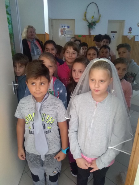 2018. október 13-án délelőtt kissé szokatlan módon csendült fel a házasságkötő teremben a Nászinduló. Az anyakönyvvezető is a szokásostól izgatottabb volt, az apró násznép megilletődötten toporgott az ajtóban. Bár hihetetlen, de nem egy filmforgatáson jártunk! Nagy Ágnes anyakönyvvezető, mint szülő hívta meg a 3. osztályt a pályaorientációs nap keretein belül a rendhagyó esküvőre. A szertartás az előírt forgatókönyv szerint zajlott, tanító nénik könnyekig hatódtak, a gyerekek minden pillanatát élvezték. A pezsgőzés sem maradt el, természetesen kölyök pezsgővel koccintottunk a nagy nap örömére. Köszönjük Nagy Ágnesnek, hogy ilyen alternatív módon engedett bepillantást a nem hétköznapi munkájába!