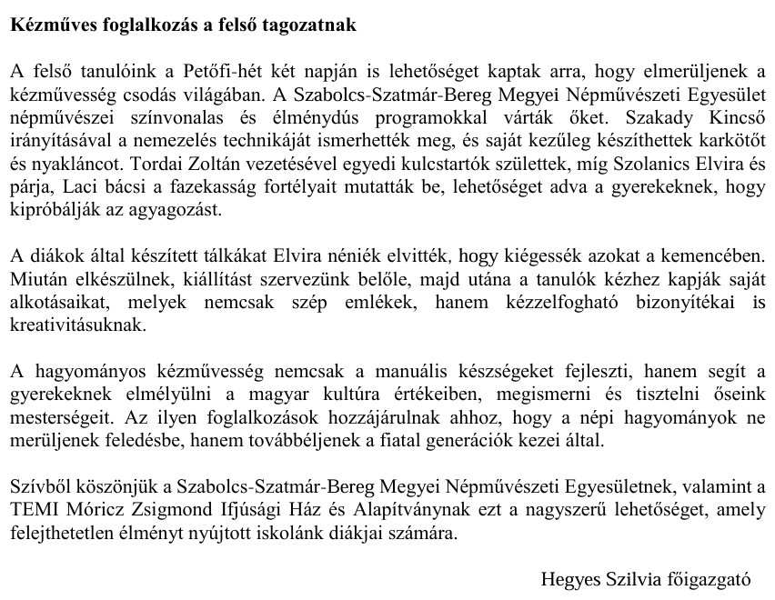 Kézműves foglalkozás a felső tagozatnak |