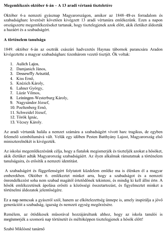 Megemlékezés október 6-án – A 13 aradi vértanú tiszteletére